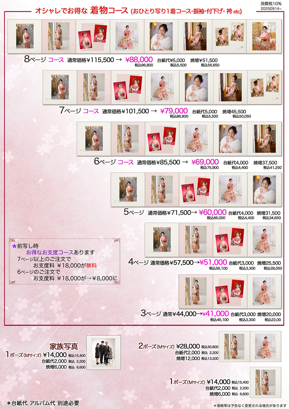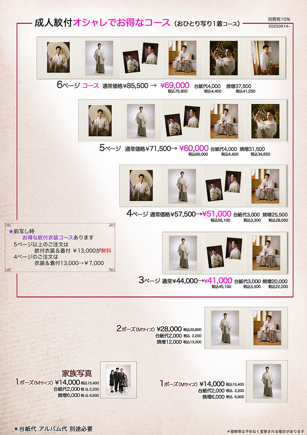当店で前撮りされた方はレンタル可能です。振袖¥50,000(税込55,000)〜・紋付袴¥50,000(税込55,000)〜(色々なランクがございます。)